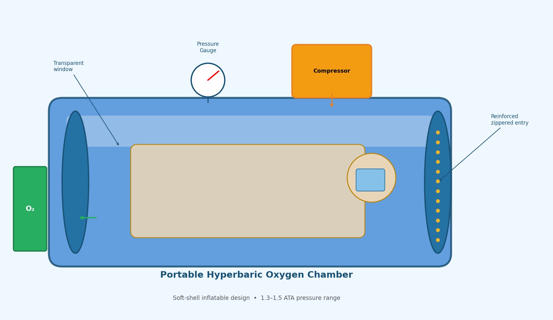An external electric air compressor inflates the chamber to target pressure. Oxygen is introduced via a separate line connected to either an oxygen concentrator (producing 90β96% pure Oβ) or a pressurized medical oxygen cylinder. Inside the chamber, the user breathes through a soft non-rebreather mask or a hood delivery system. Flow rates of 8β10 liters per minute are typical at 1.3β1.5 ATA.